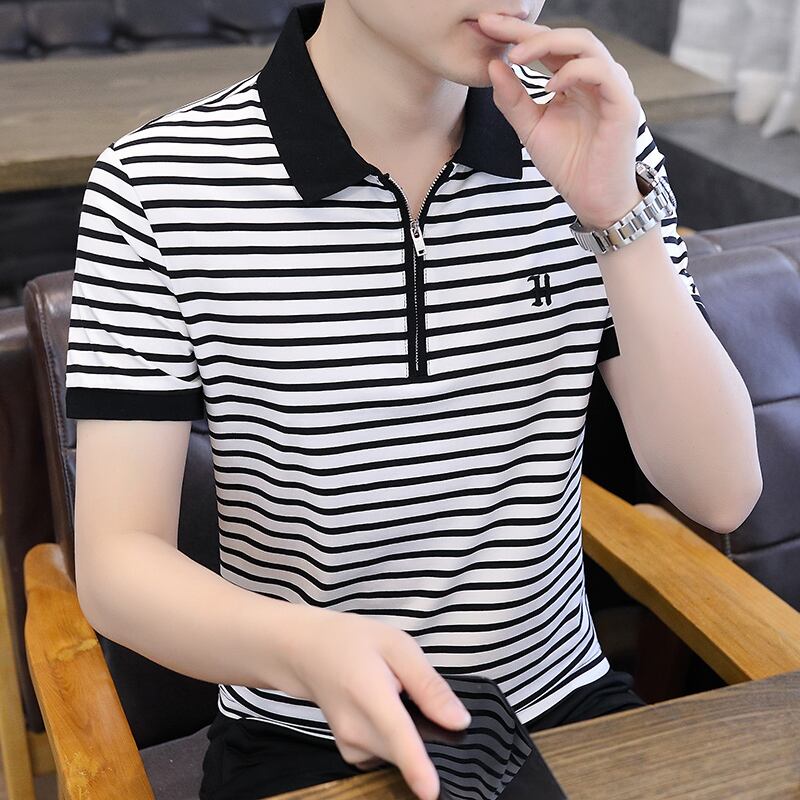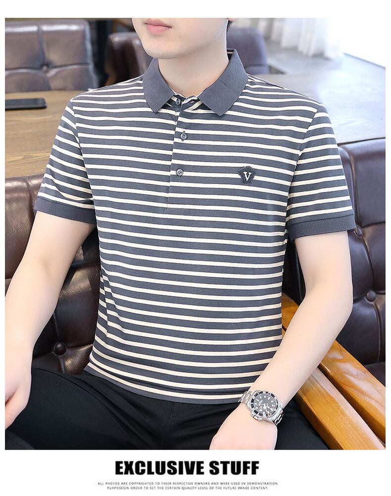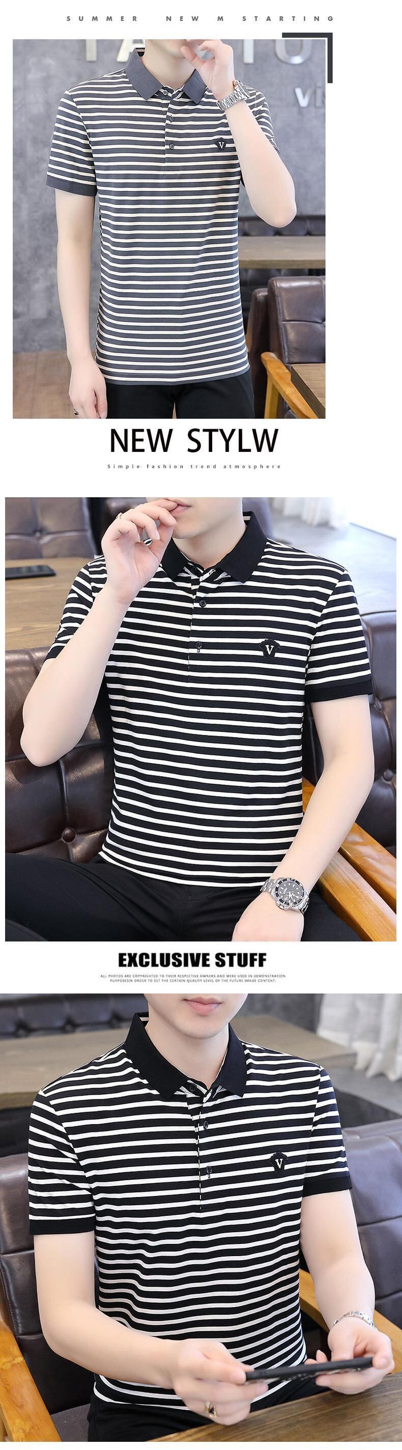 Summer striped short-sleeved t-shirt men's trend lapel POLO shirt youth business casual cotton t-shirt men's top コットン カジュアル サマー 夏物 ストライプ Tシャツ doushi32650631570