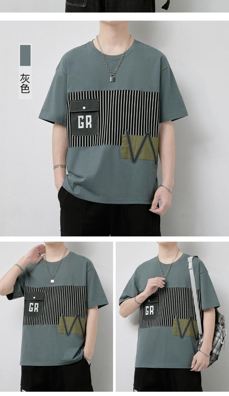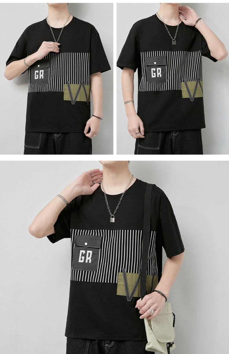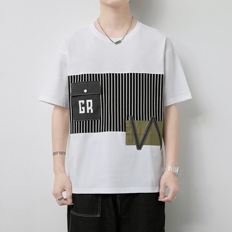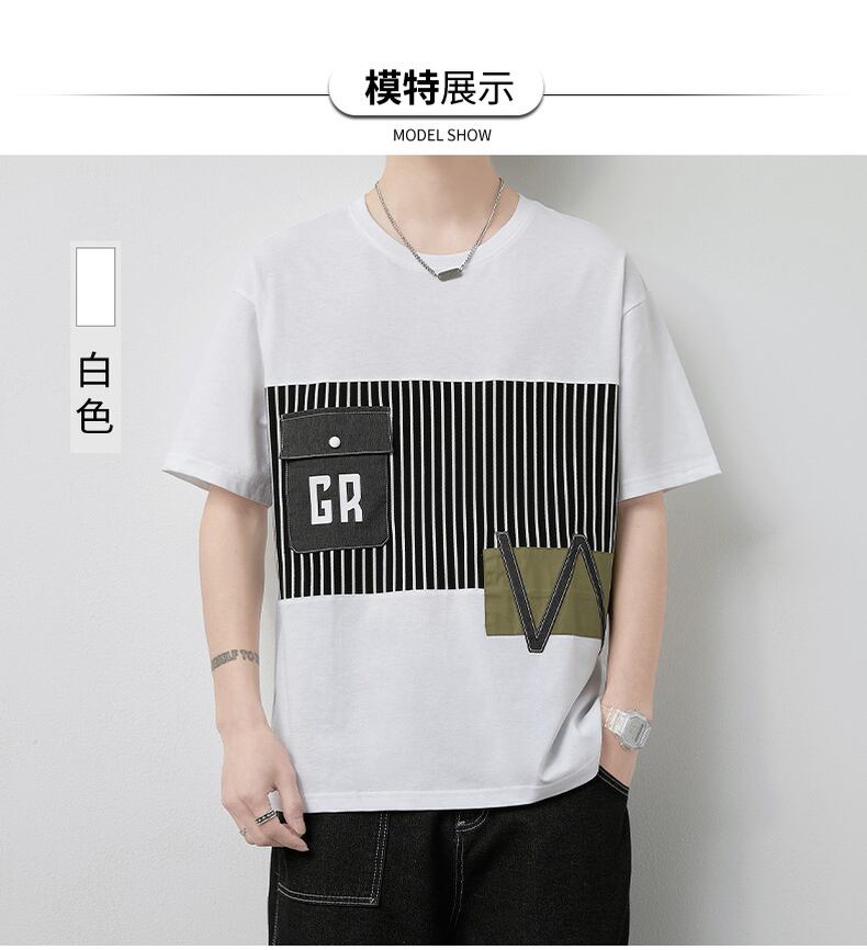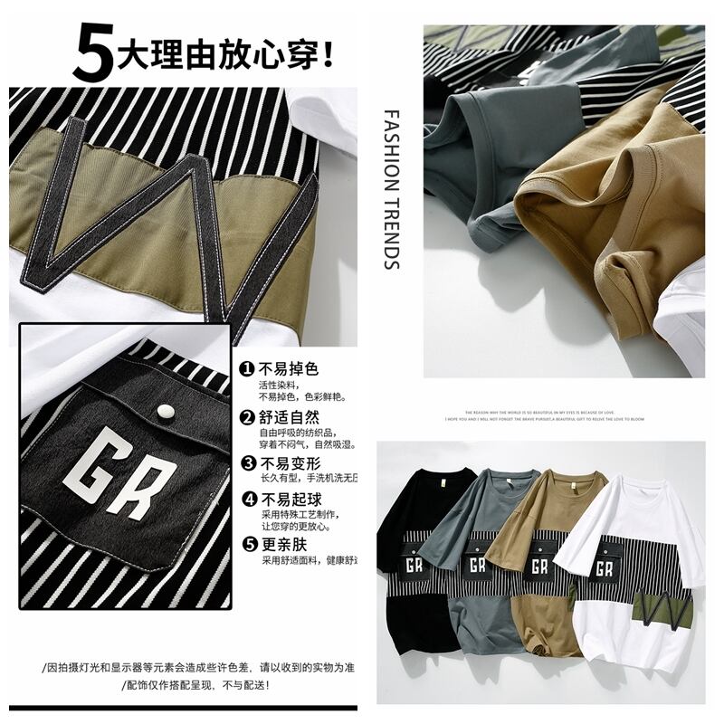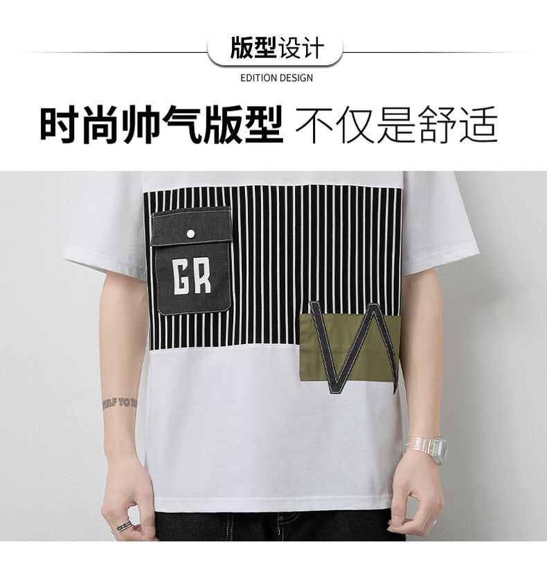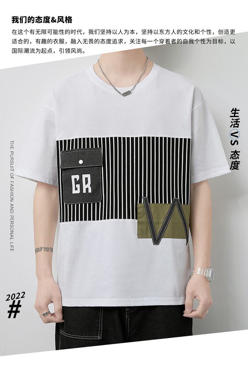 2022 summer new short-sleeved cotton T-shirt fashion trend loose and comtable personality stitching striped round neck t-shirt men コットン サマー 夏物 Oネック ストライプ Tシャツ ステッチ doushi62566216393