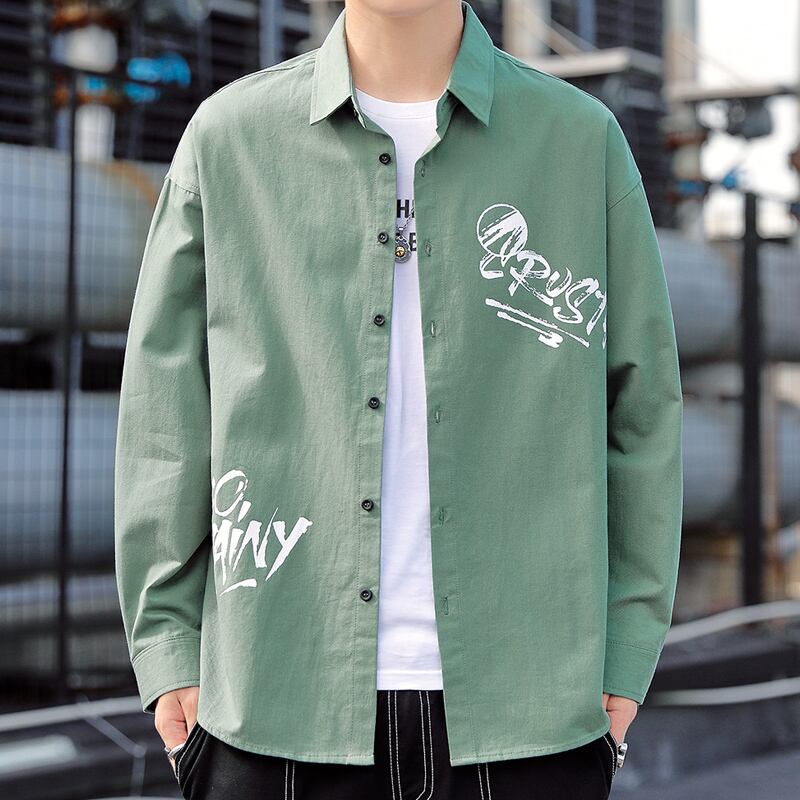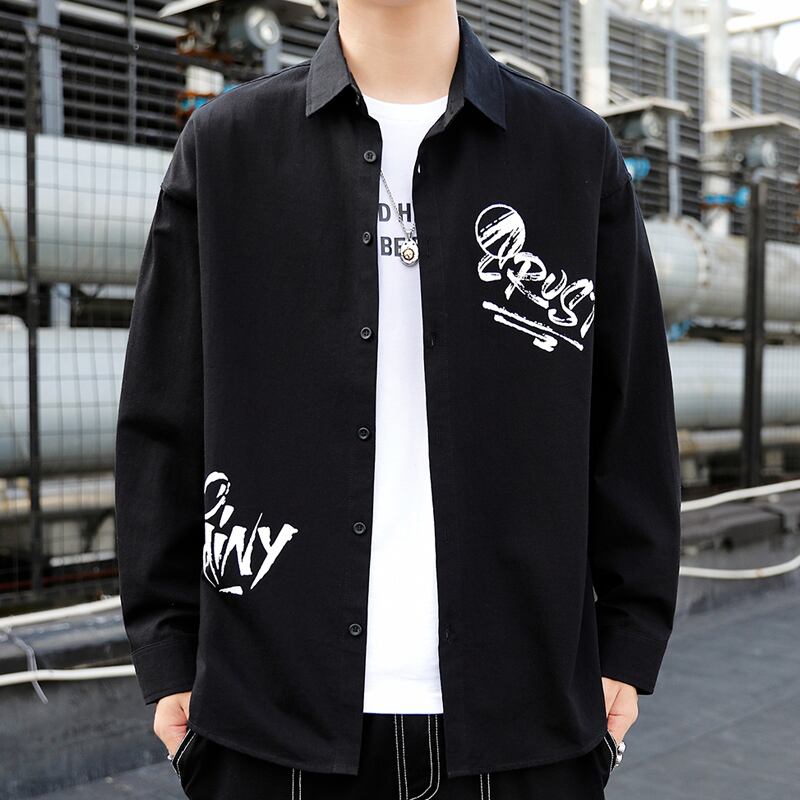 Cotton shirt men's long-sleeved autumn thin coat loose Hong Kong style design print top clothes men's casual shirt ロング コットン カジュアル オータム 秋物 doushi99184421716