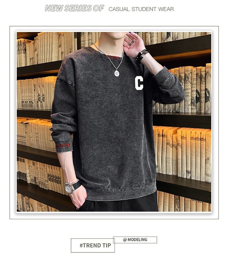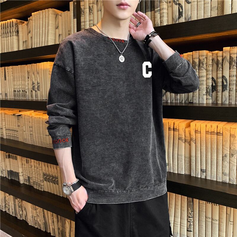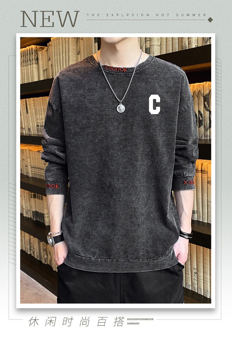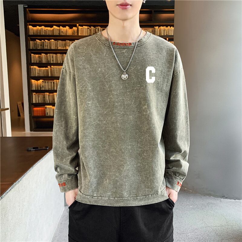 Denim long-sleeved t-shirt men's spring and autumn models washed and old embroidered round neck sweater men's retro trend mountain bottoming shirt ロング レッド レトロ 刺繍 スプリング 春物 オータム 秋物 Oネック Tシャツ doushi80944893415