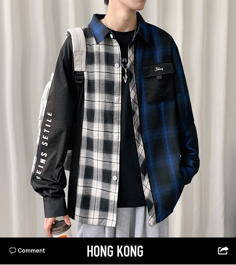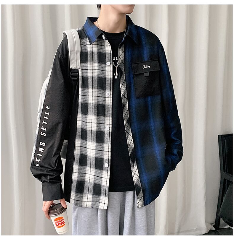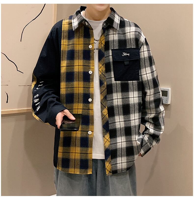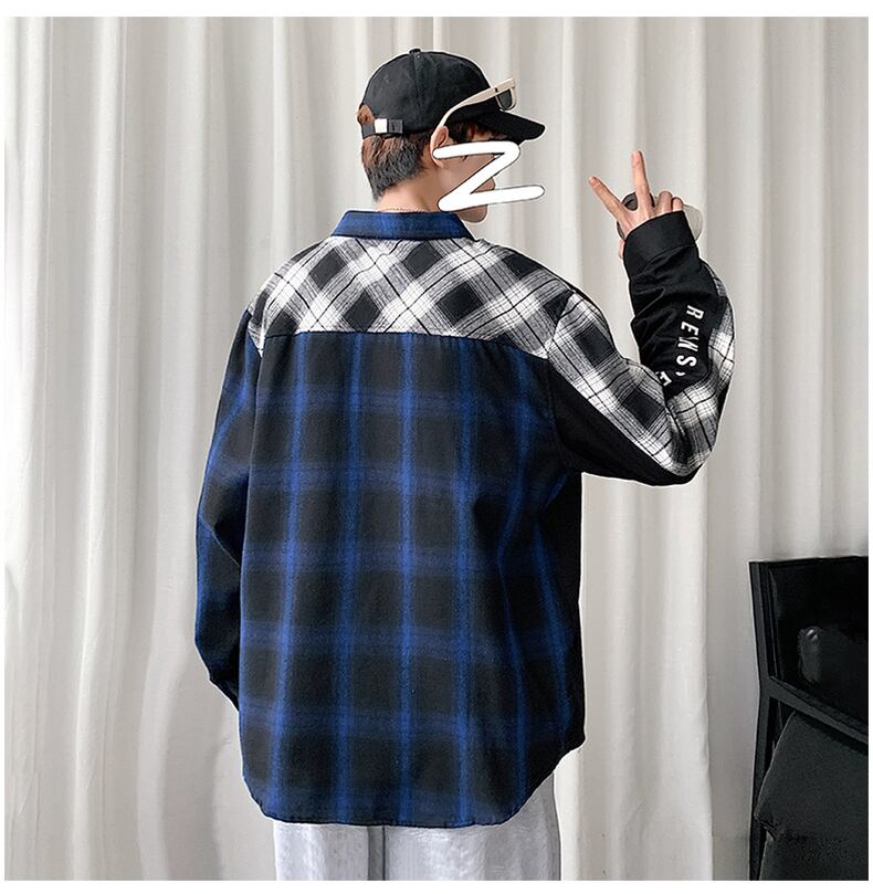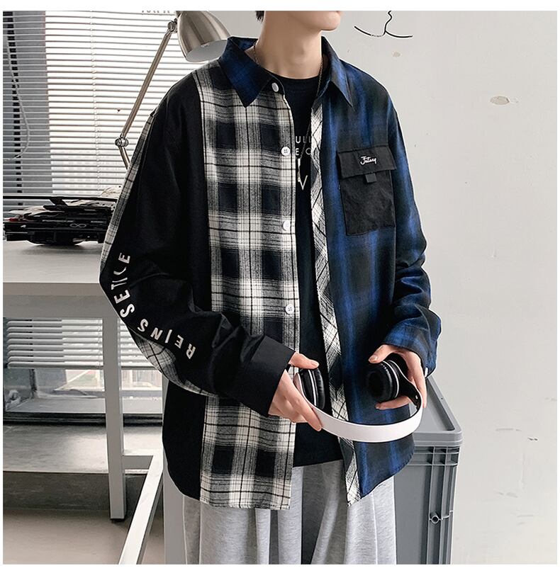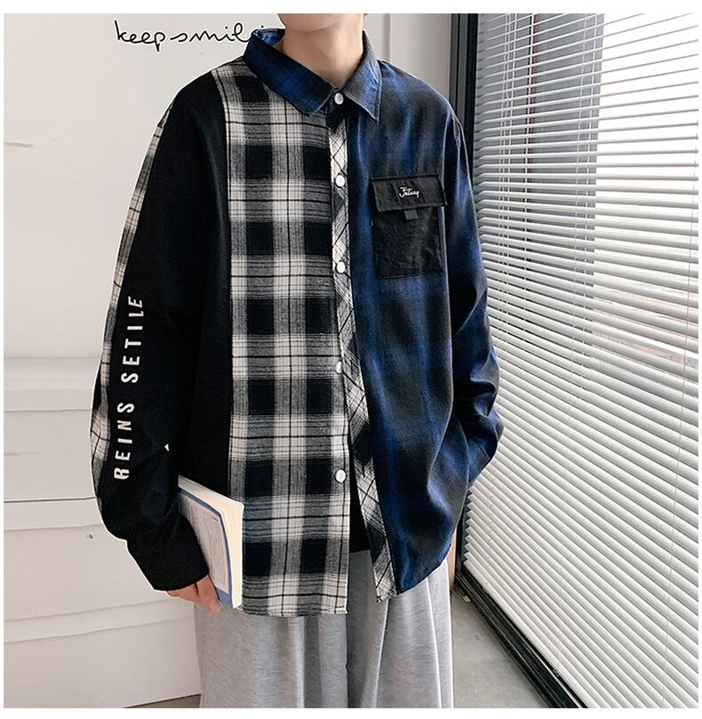 Plaid shirt men's long-sleeved autumn personality contrast color stitching inch shirt men's jacket youth niche casual shirt ロング カジュアル オータム 秋物 ステッチ doushi49834174200