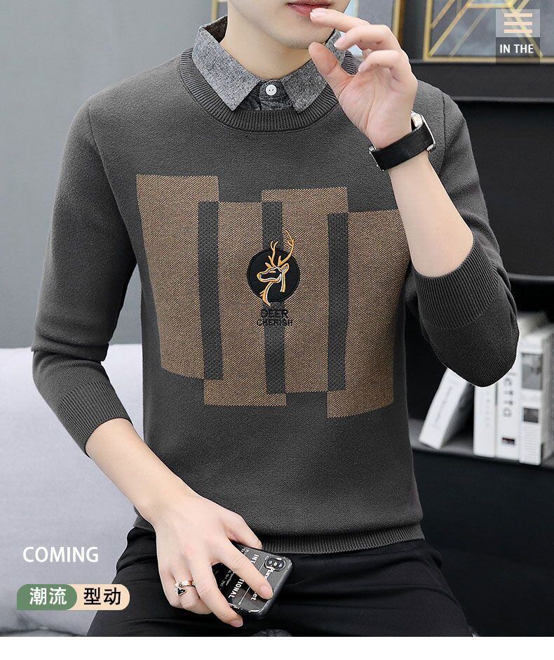Fake two-piece sweater men's shirt collar sweater autumn and winter style trend embroidery plus velvet thick bottom line 刺繍 オータム 秋物 ウィンター 冬物 doushi79371300516