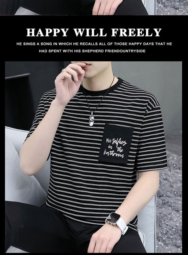 Ice silk short-sleeved T-shirt men's summer new high-end casual striped t-shirt loose large size tide brand round neck top カジュアル 大きめサイズ サマー 夏物 Oネック ストライプ シルク Tシャツ doushi99319239743