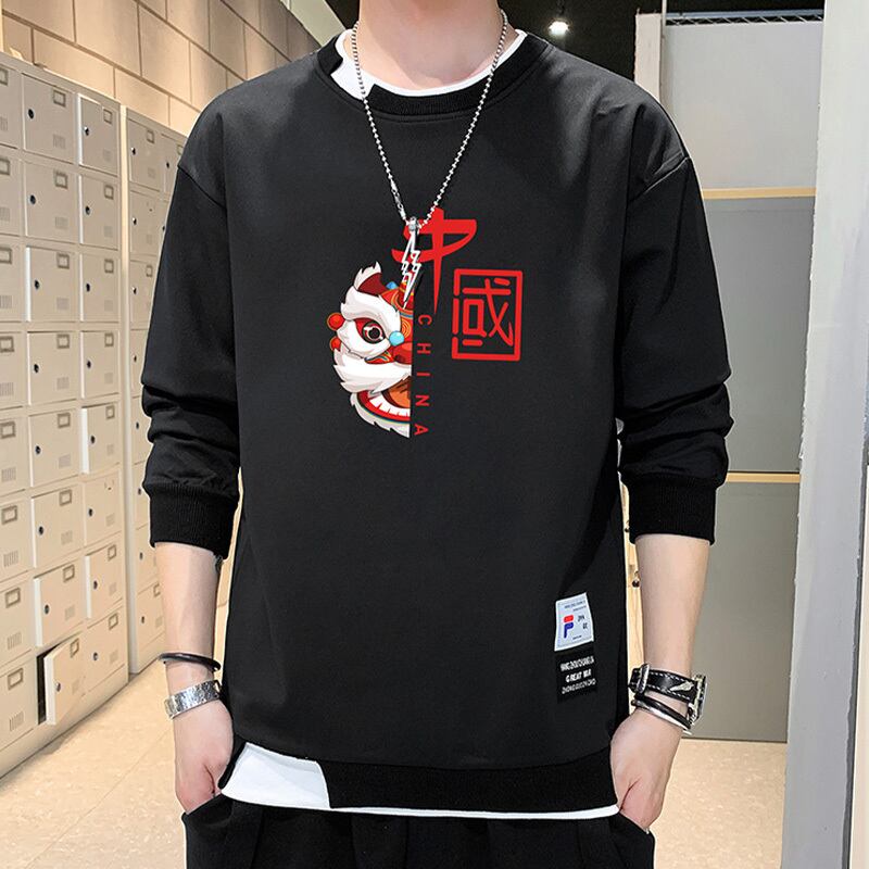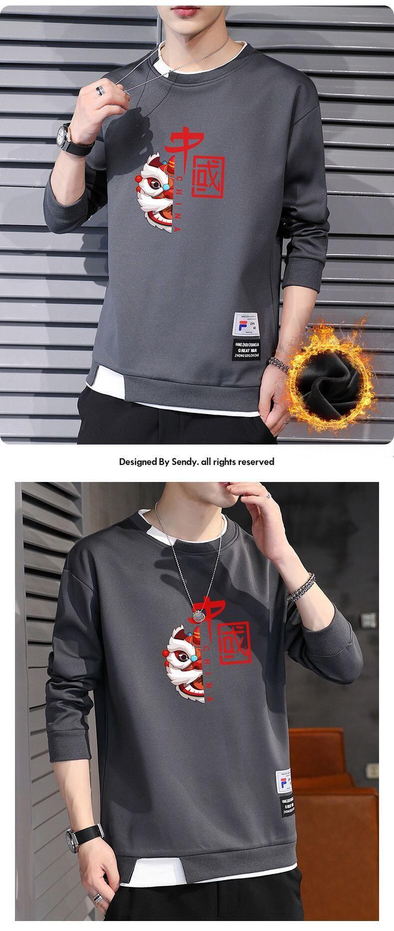 Fake two-piece sweater men's spring and autumn round neck national tide printing bottoming shirt plus velvet thickening early autumn boys long-sleeved T-shirt ロング スプリング 春物 オータム 秋物 Oネック Tシャツ doushi43376560319