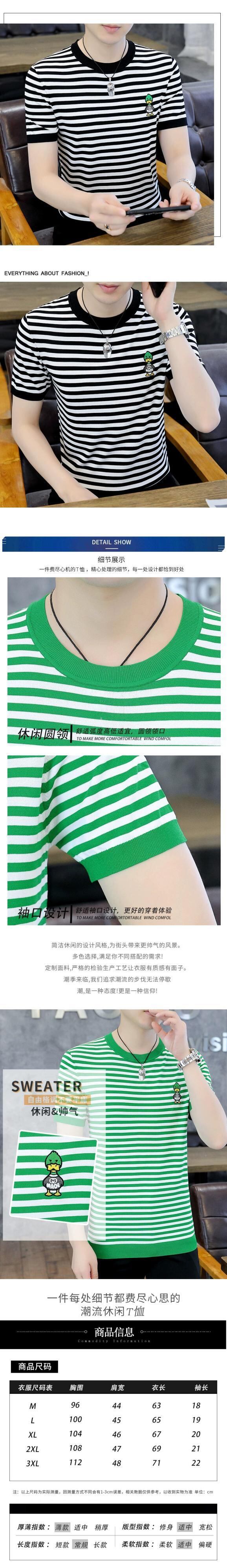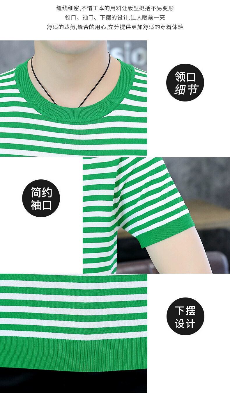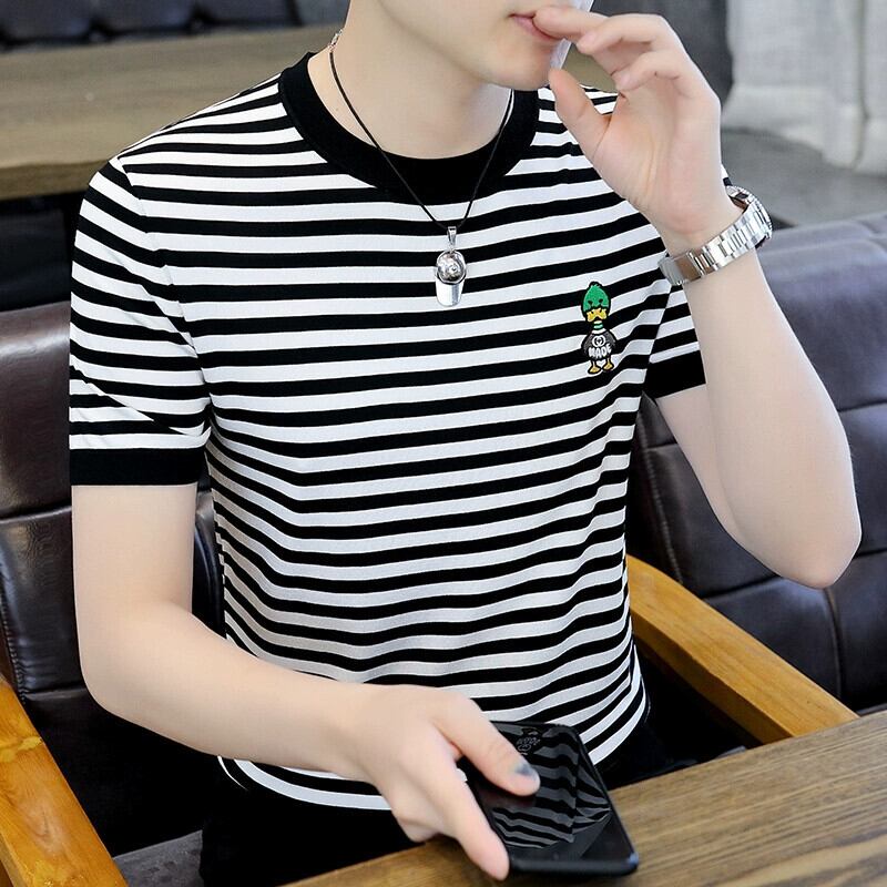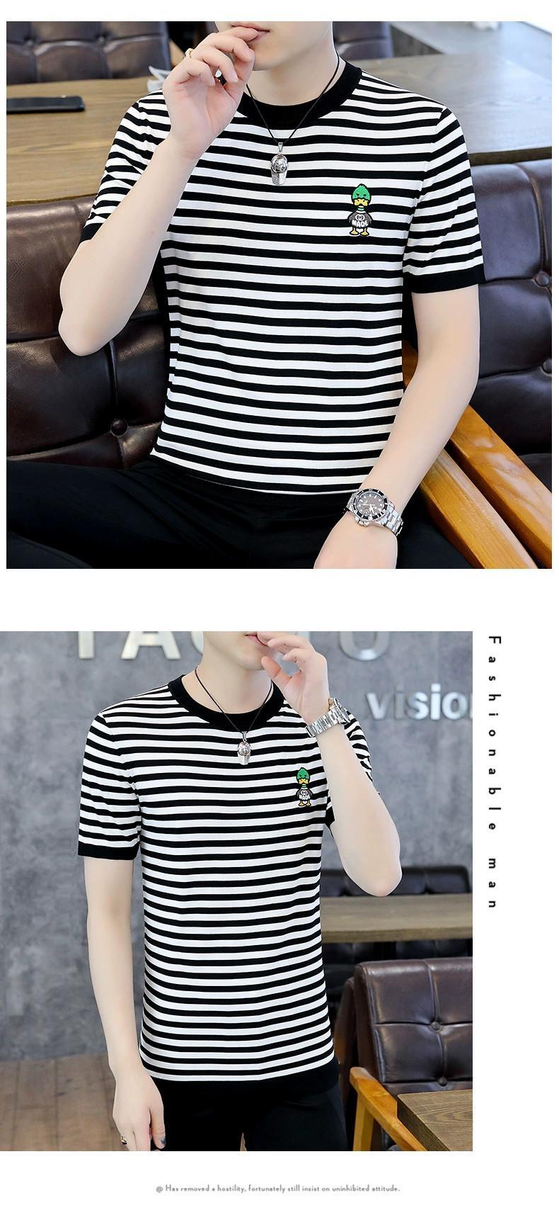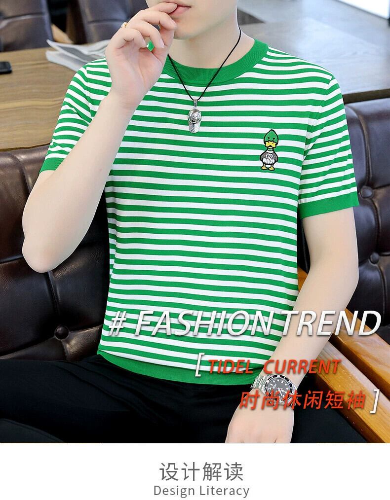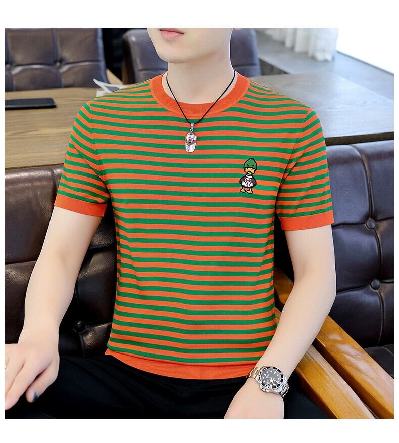 夏の新しいアイスシルク T シャツメンズラウンドネック半袖バージョンのスリム薄いセクションニットストライプアヒル刺繍半袖 レッド サマー 夏物 Oネック Tシャツ undao62993364719