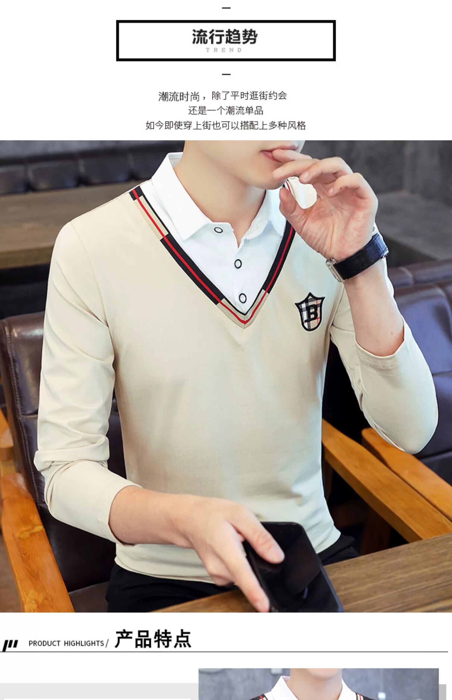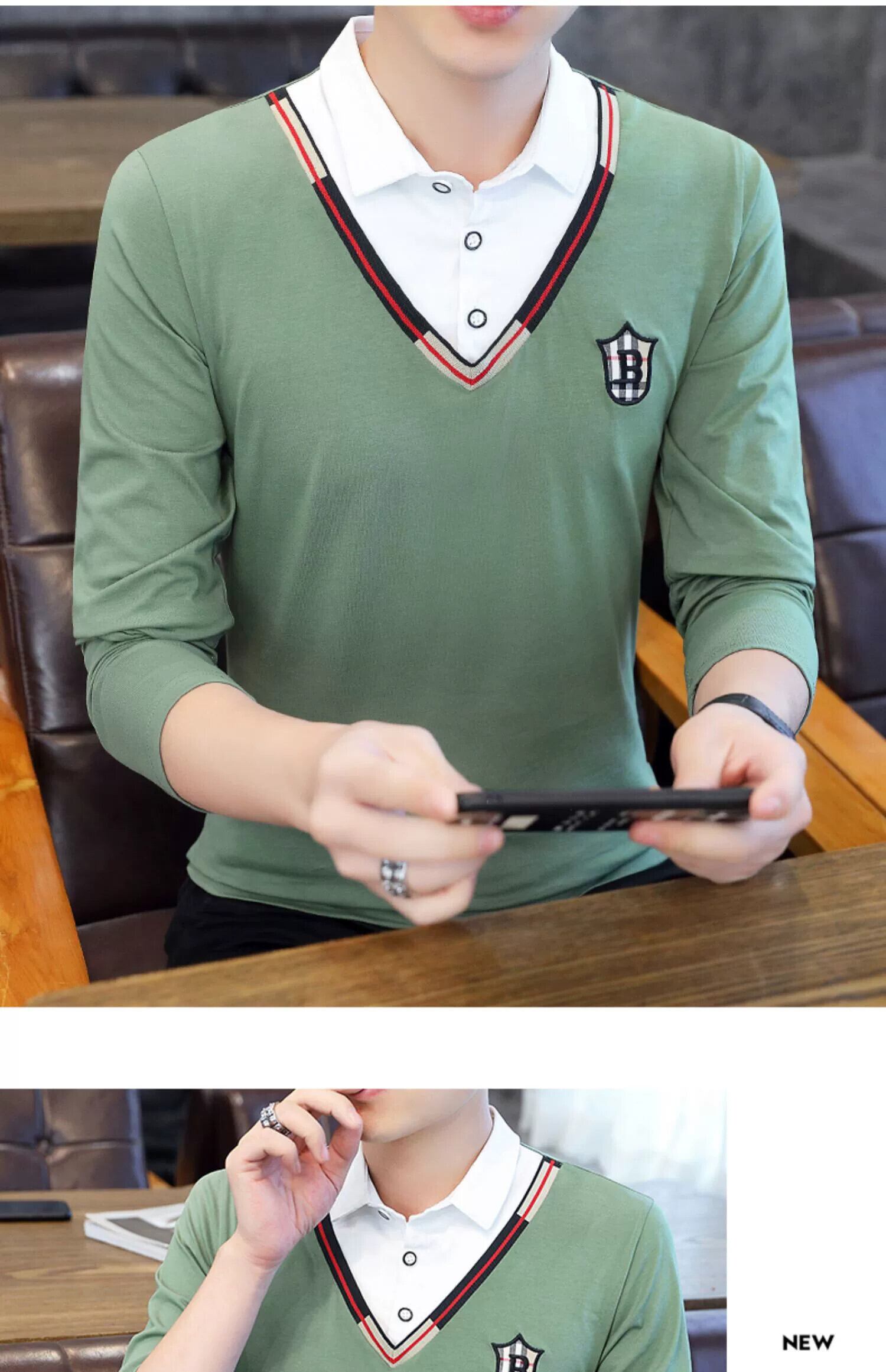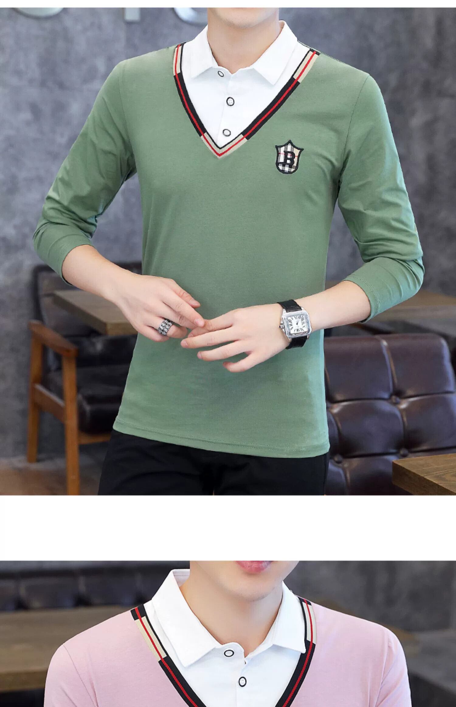 フェイクツーピースポロシャツメンズ春秋スタイルシャツ襟長袖TシャツスタイルトレンディスリムVネック刺繍トップス服 ロング スプリング 春物 オータム 秋物 undao4777463453