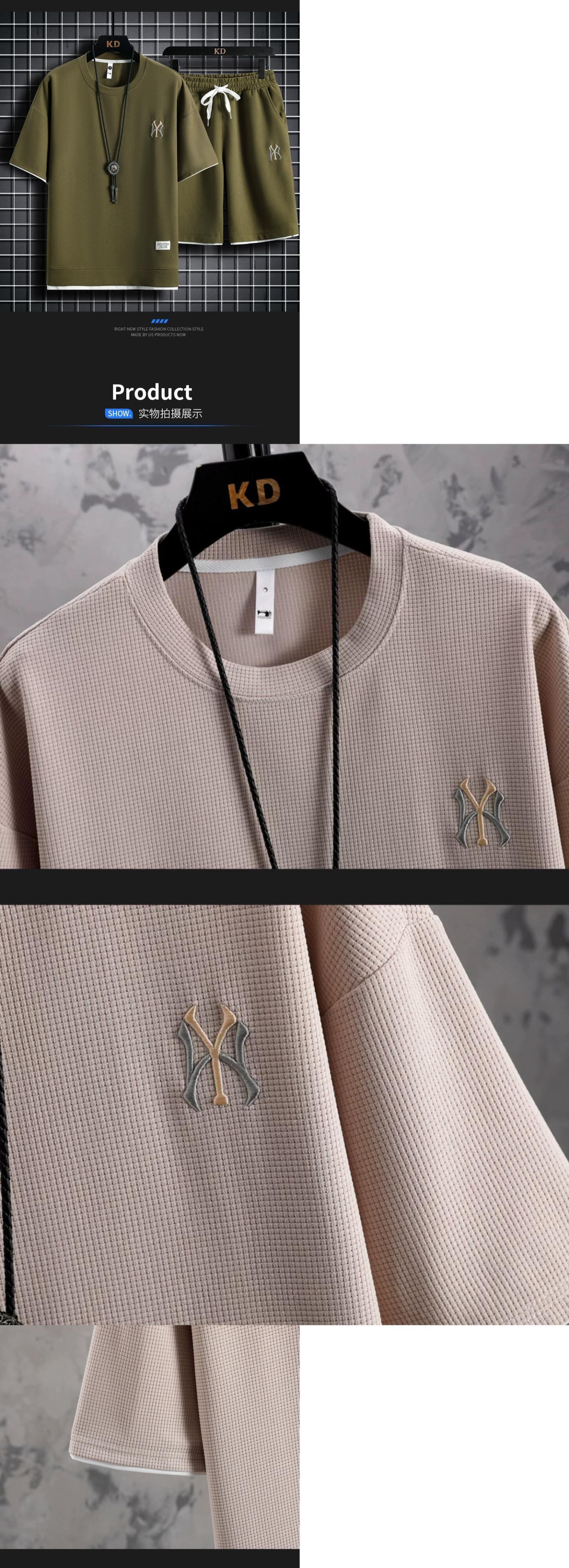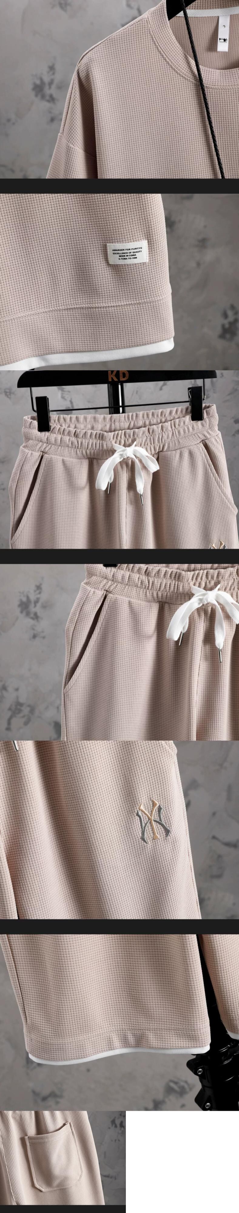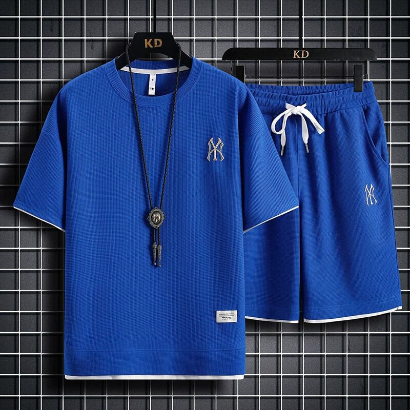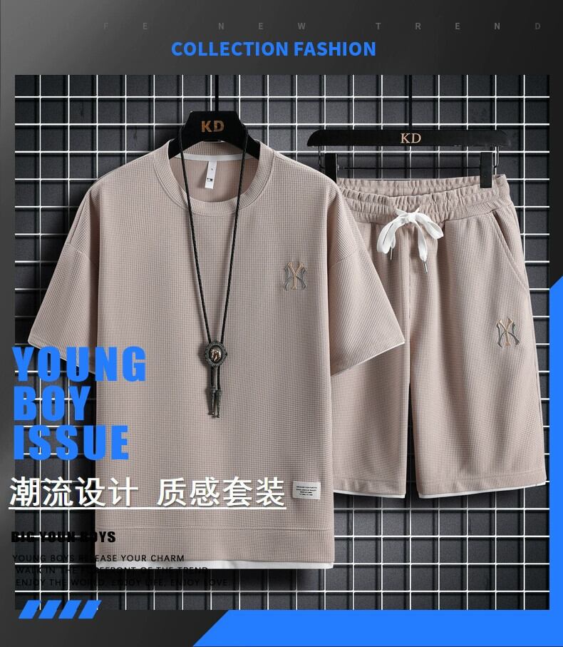 フェイクツーピース半袖Tシャツメンズ夏刺繍ワッフル服セットカジュアルスポーツメンズスーツ サマー 夏物 undao98234119447