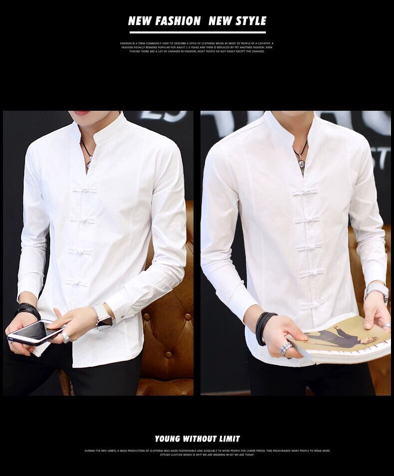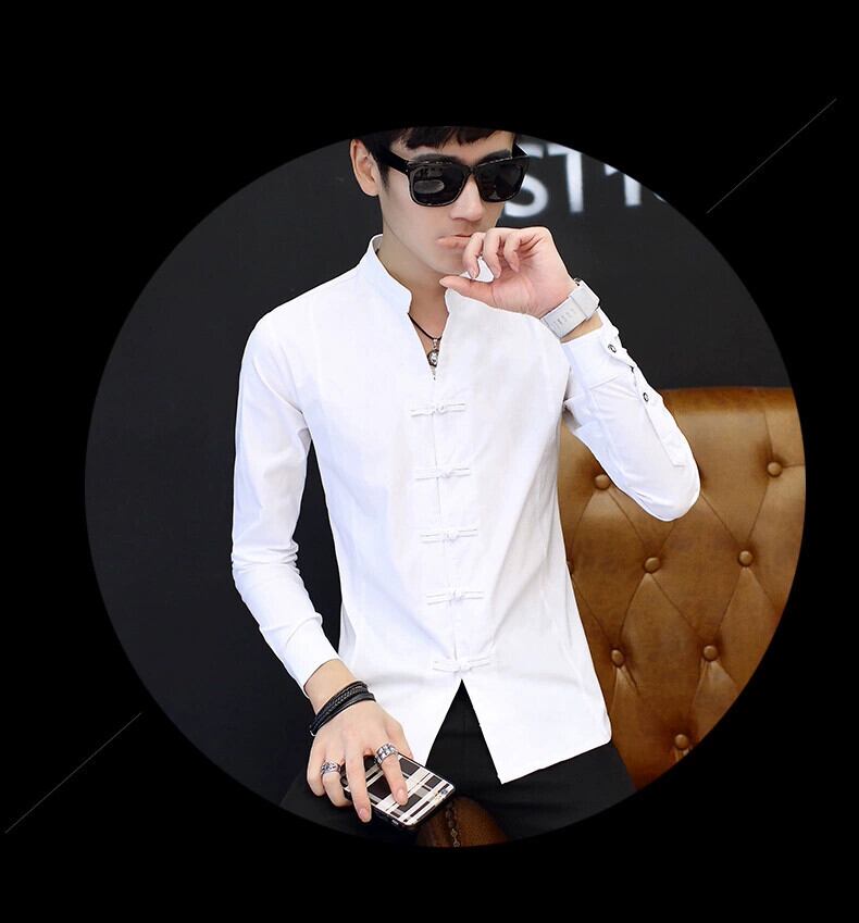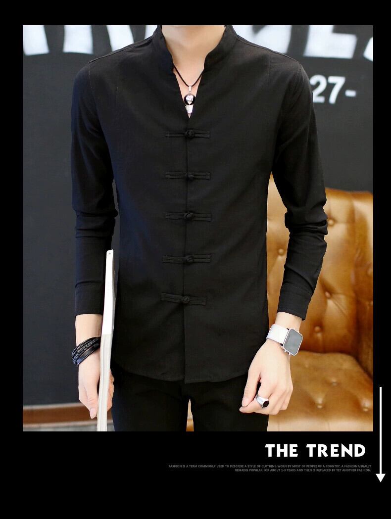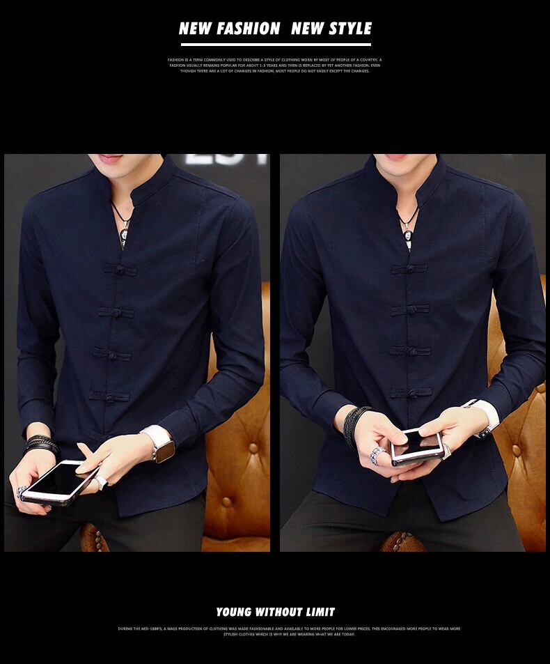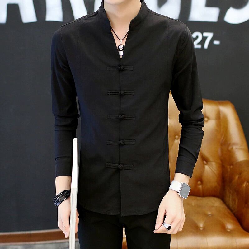 春リネン長袖 Tシャツメンズスリムフィット唐スーツ布ボタンラウンドネックコットンリネン半袖若者アンティーク Tシャツトレンド ロング スプリング 春物 Oネック undao5968602346