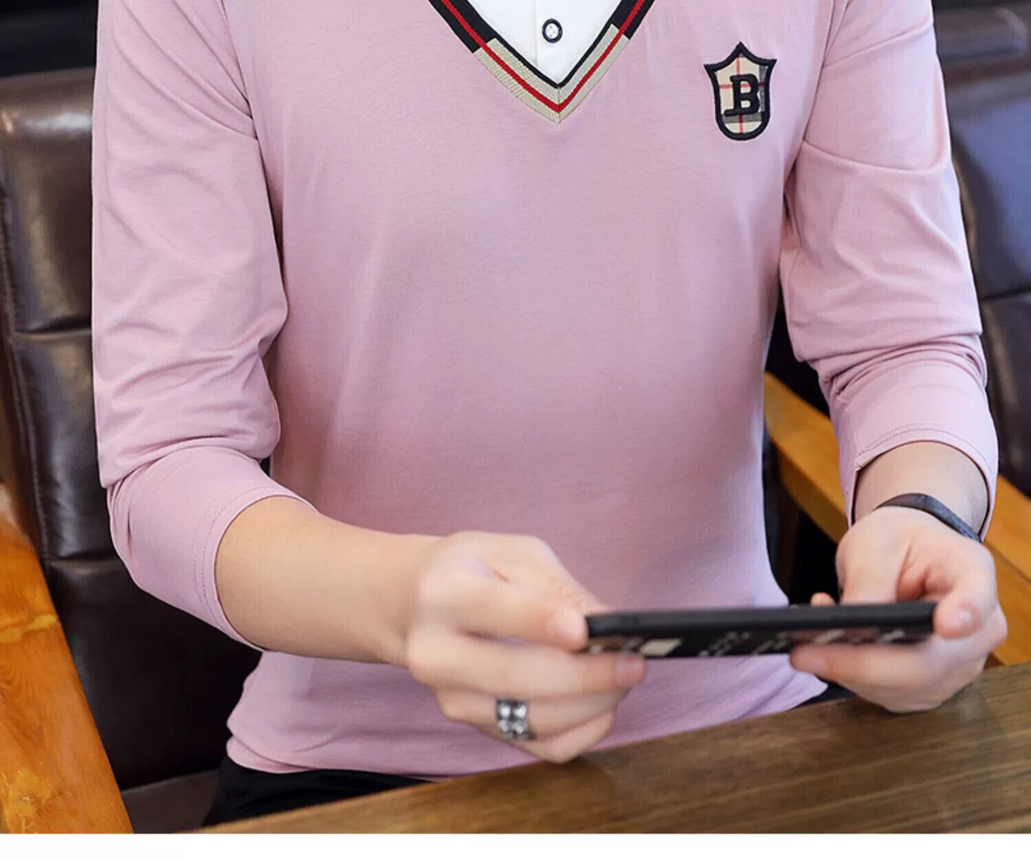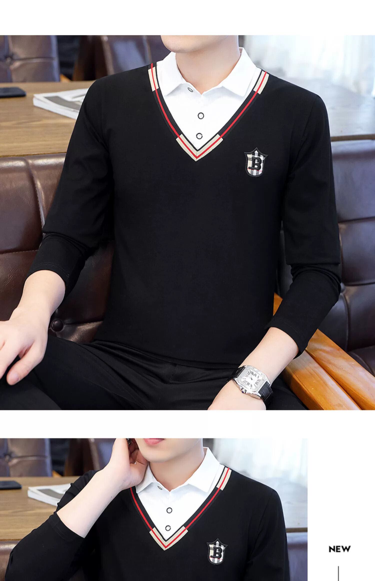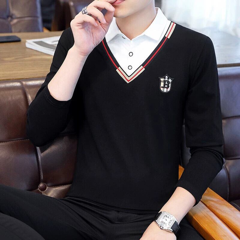 フェイクツーピース長袖Tシャツメンズ春秋スタイルトレンドシャツ襟底シャツ潮ブランド刺繍春トップ ロング スプリング 春物 オータム 秋物 undao63456091434