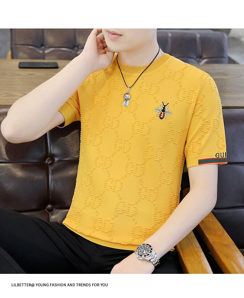 蜂刺繍ニット Tシャツメンズ潮サマードレス薄いアイスシルクレッド半袖トップエンドボディシャツ 夏物 undao36201358747
