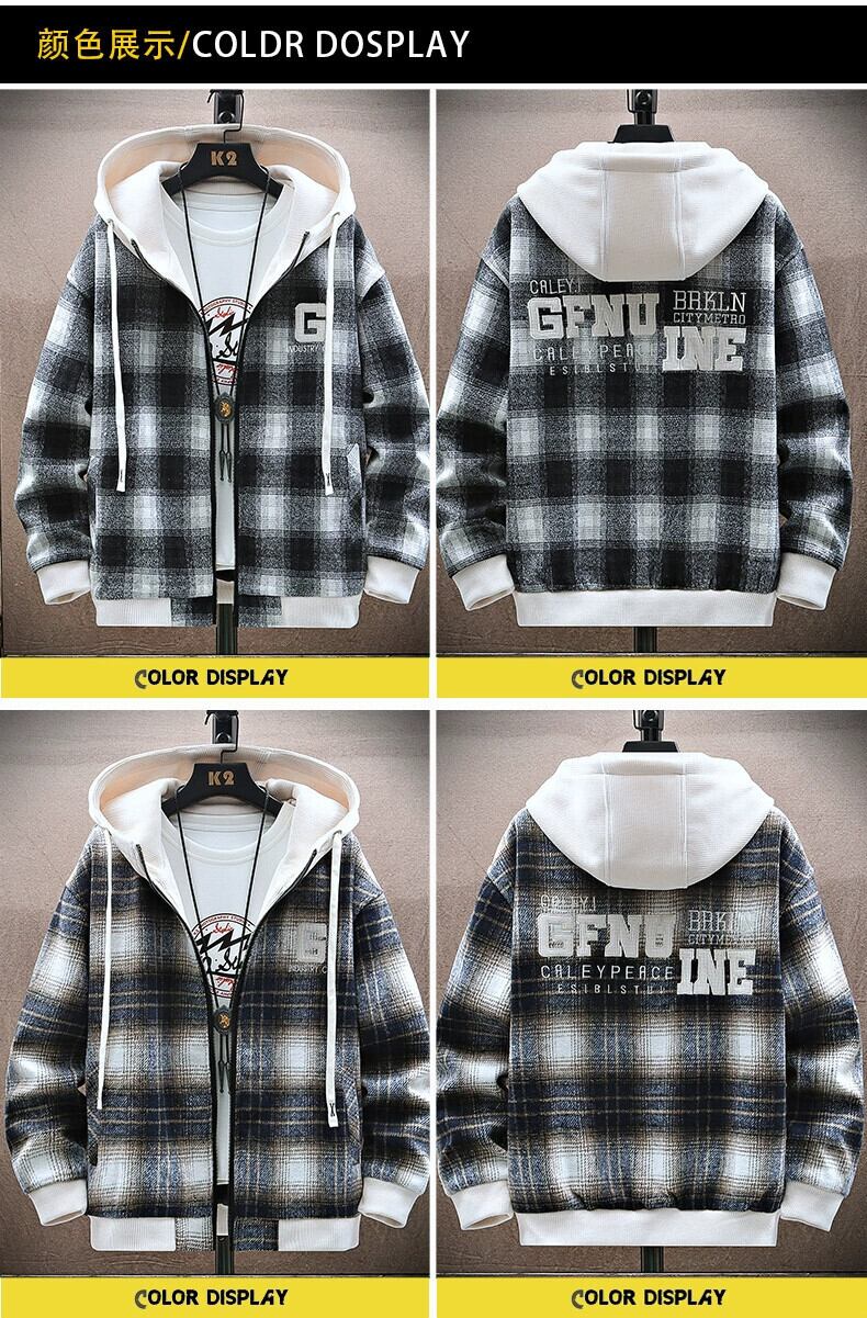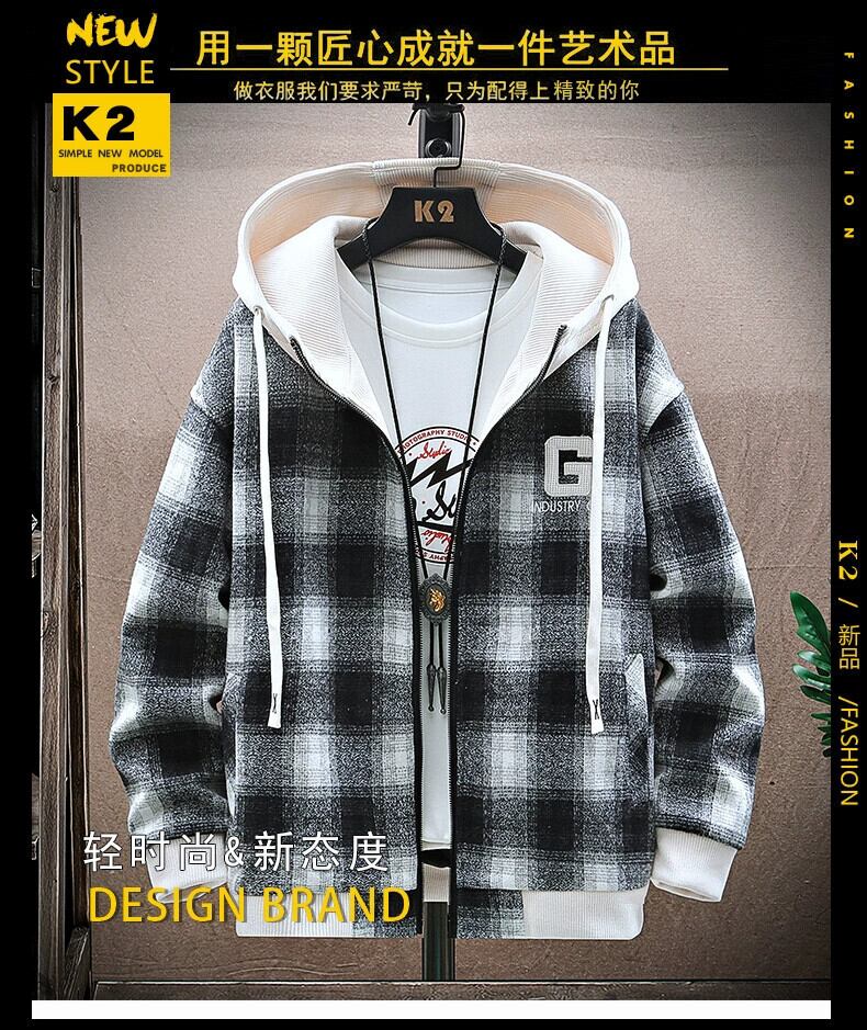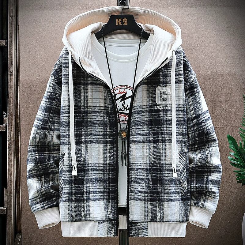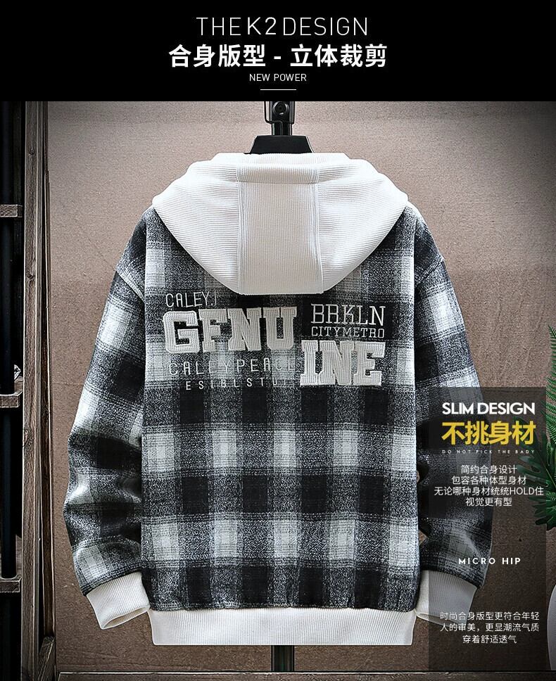 チェック柄ウールジャケットメンズ春と秋のトレンディなルーズフード付きジャケットメンズトレンディな厚みのあるガウン男性 スプリング 春物 オータム 秋物 undao65774918910