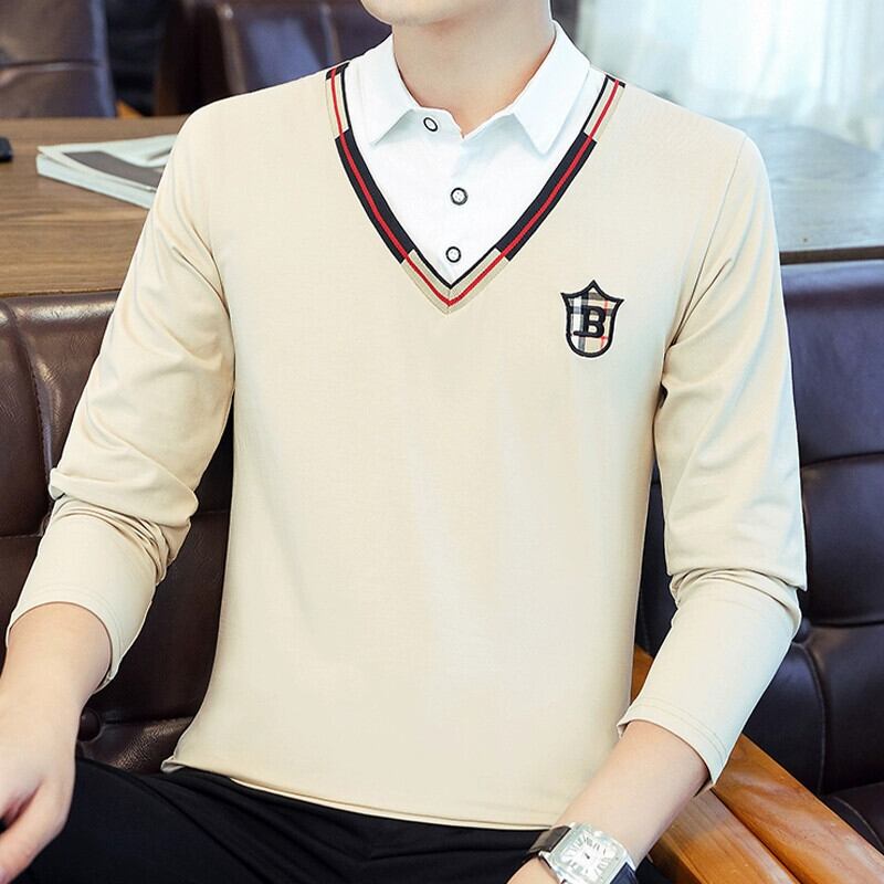 2023 春と秋のライト高級フェイクツーピースポロシャツメンズシャツ襟長袖 t シャツバージョンスリム V ネック刺繍トップ ロング スプリング 春物 オータム 秋物 Vネック Tシャツ undao81312539778