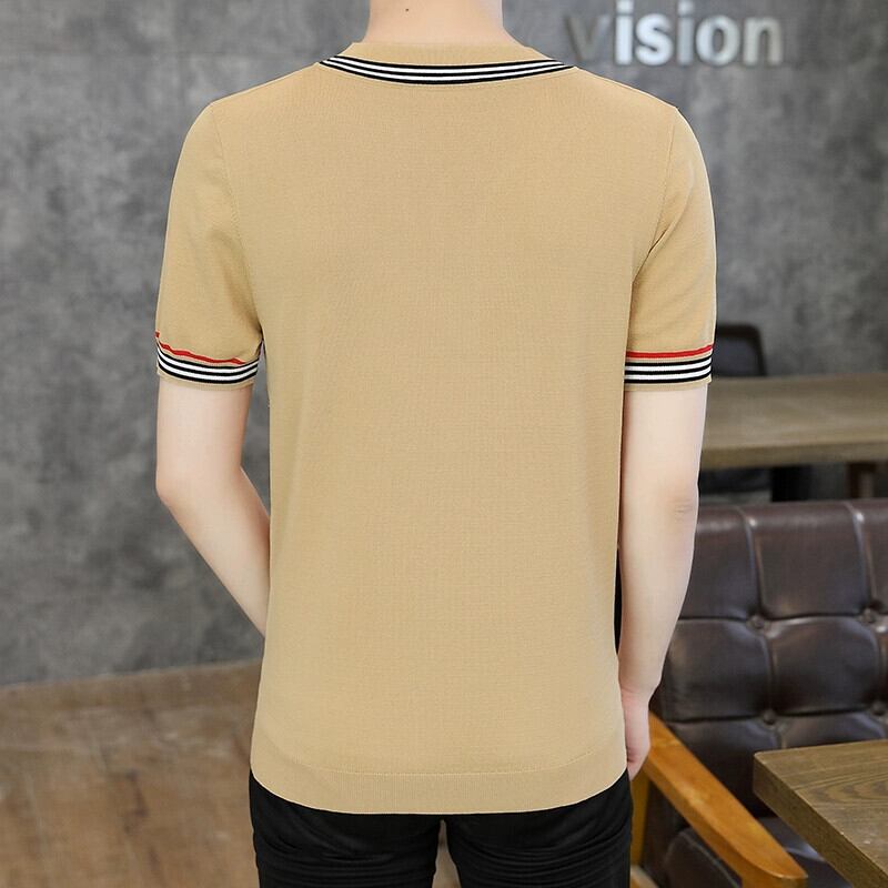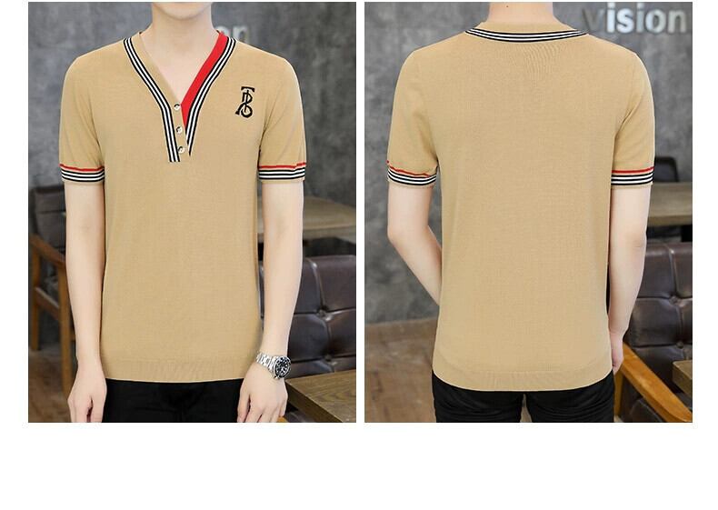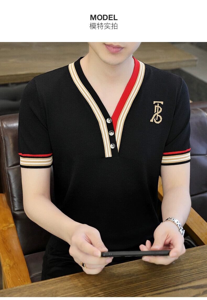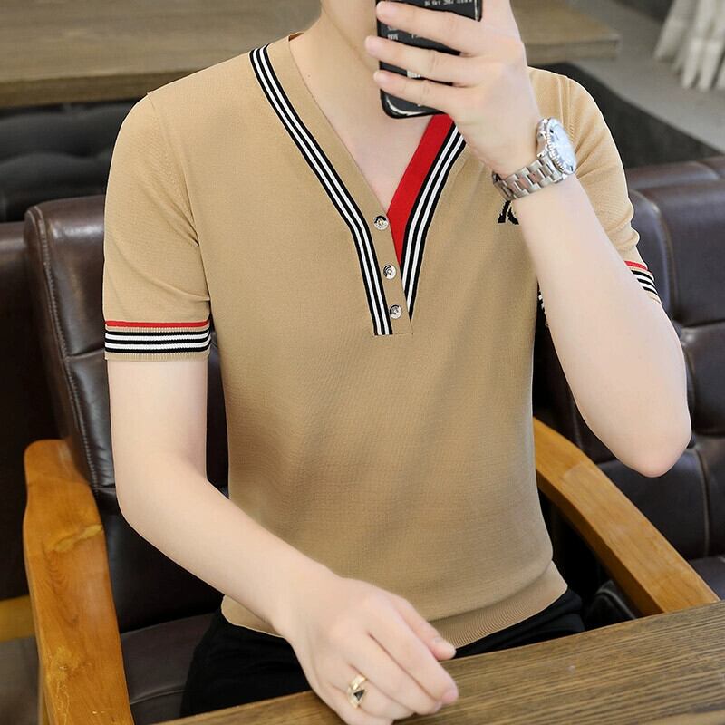 2023 夏の新メンズ V ネックアイスシルクニット半袖 T シャツバージョンのスリムフィットコントラストカラープルオーバー半袖ボトリングシャツ サマー 夏物 Vネック Tシャツ undao578639373