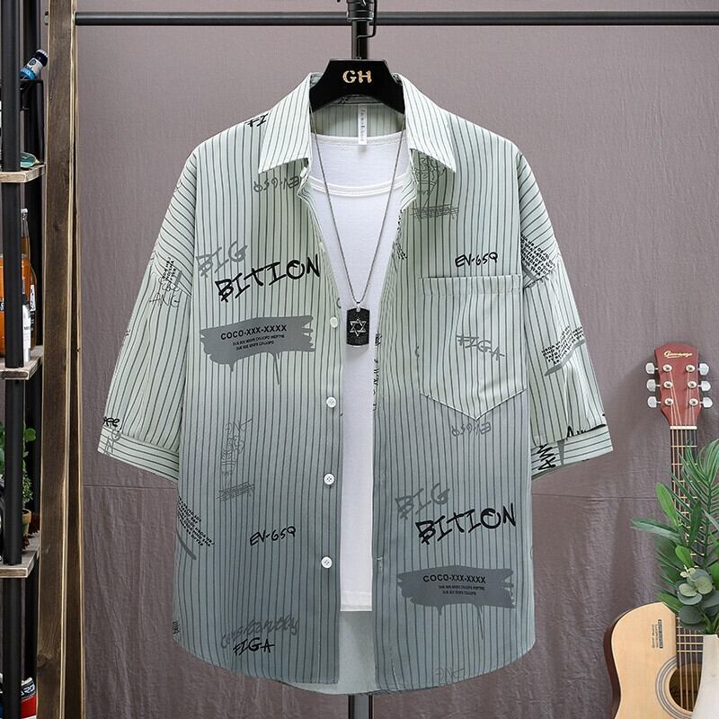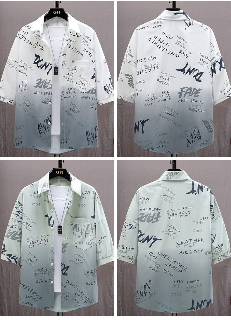 サマーシャツ メンズ 半袖 横顔 アイスシルク 五分袖シャツ レタープリント トレンド メンズ 薄手コート 夏物 undao48974961485