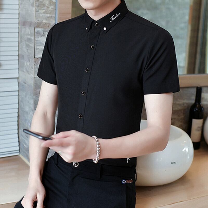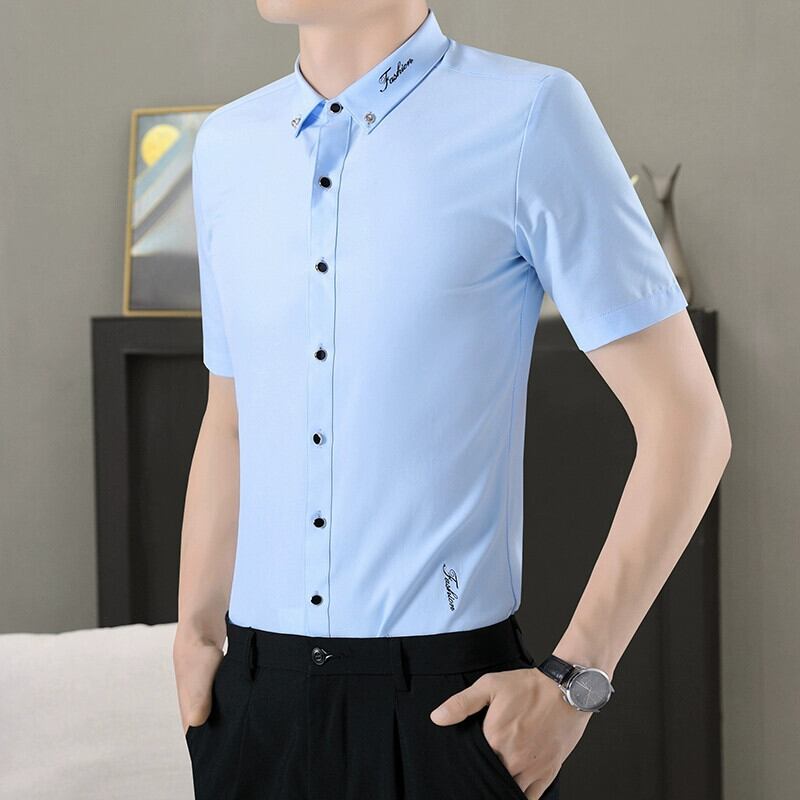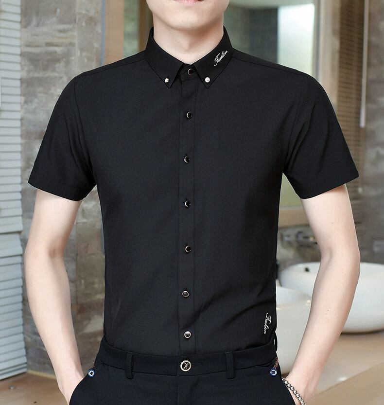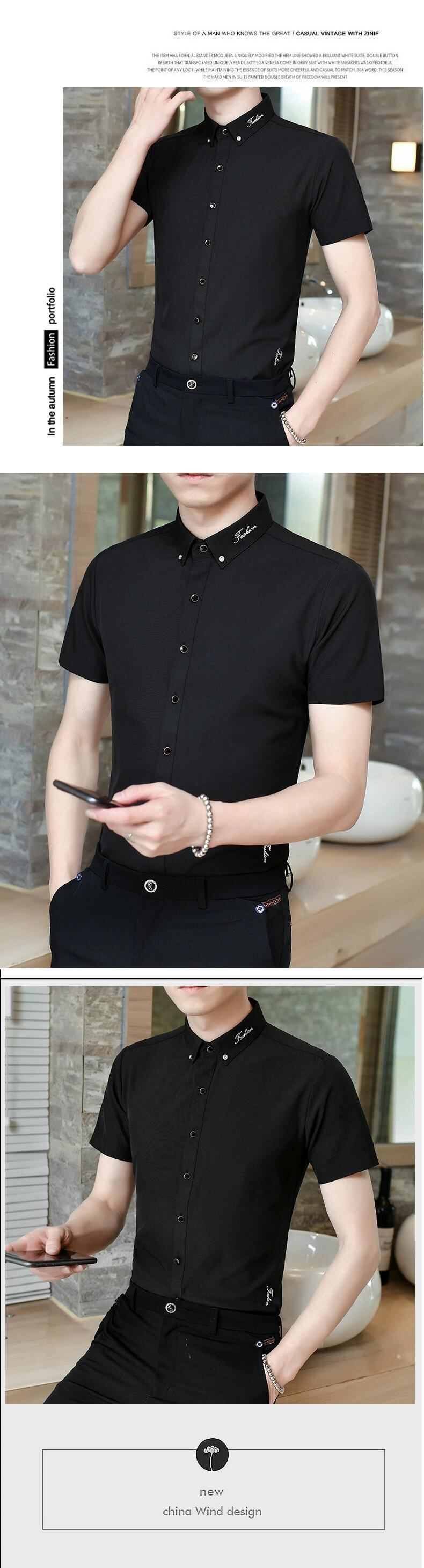 夏弾性シャツメンズ半袖スリムカジュアル非アイロンアイスシルクシャツメンズ刺繍黒ならず者ハンサムインチシャツトレンディ ブラック エラスティック 伸縮 サマー 夏物 undao88877315197