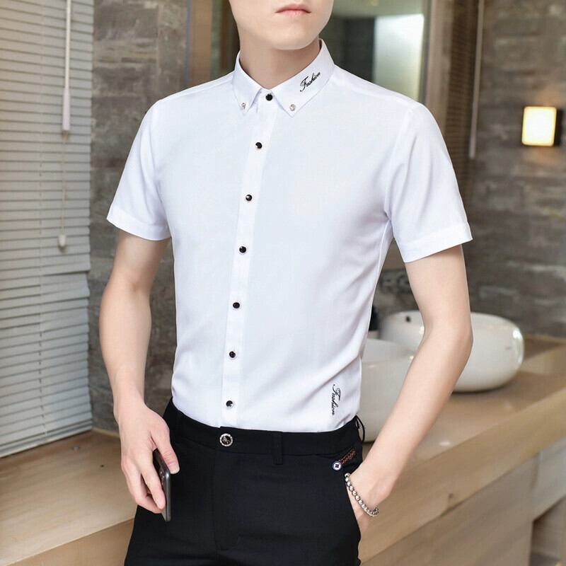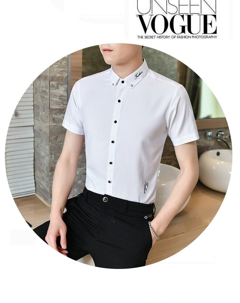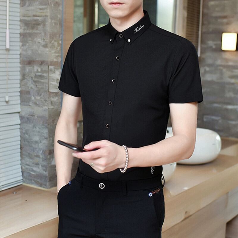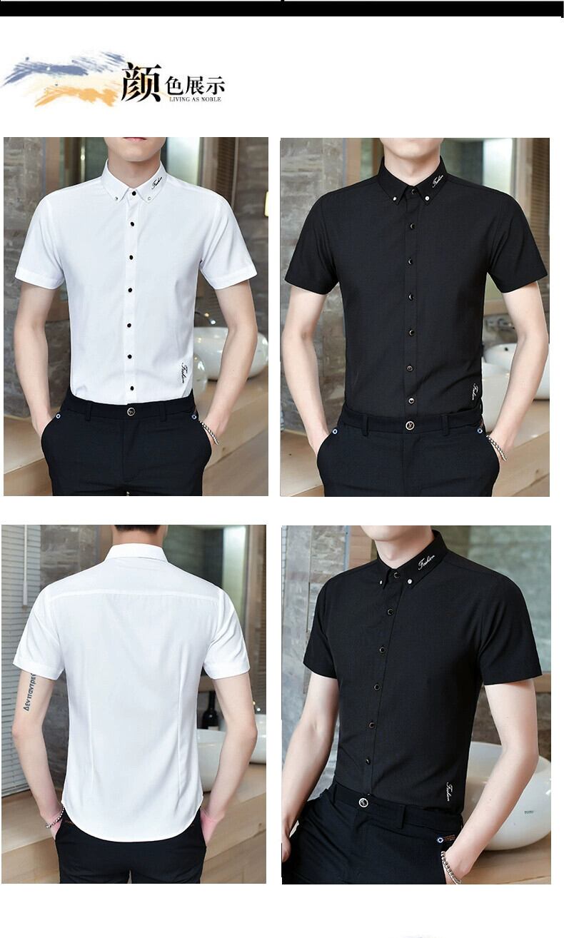 夏弾性シャツメンズ半袖スリムカジュアル非アイロンアイスシルクシャツメンズ刺繍黒ならず者ハンサムインチシャツトレンディ ブラック エラスティック 伸縮 サマー 夏物 undao88877315197