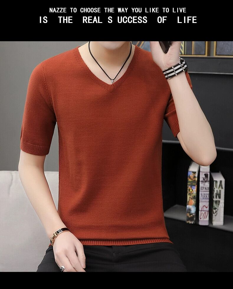 夏薄い半袖セーターメンズ v ネックアイスシルク tシャツリネン半袖ニットボトムシャツスリム男性無地通気性 サマー 夏物 Vネック ソリッドカラー undao57816890580