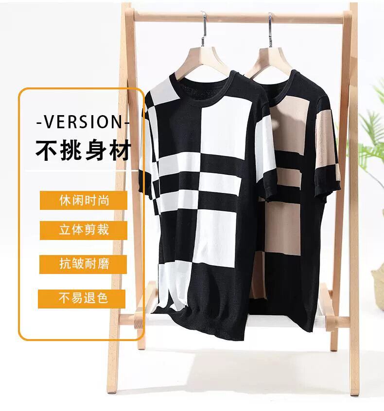 メンズニット半袖 Tシャツ夏のハイエンドスリムアイスシルクラウンドネックトップ薄いカジュアルチェック柄半袖 Tシャツ サマー 夏物 Oネック undao20329556144