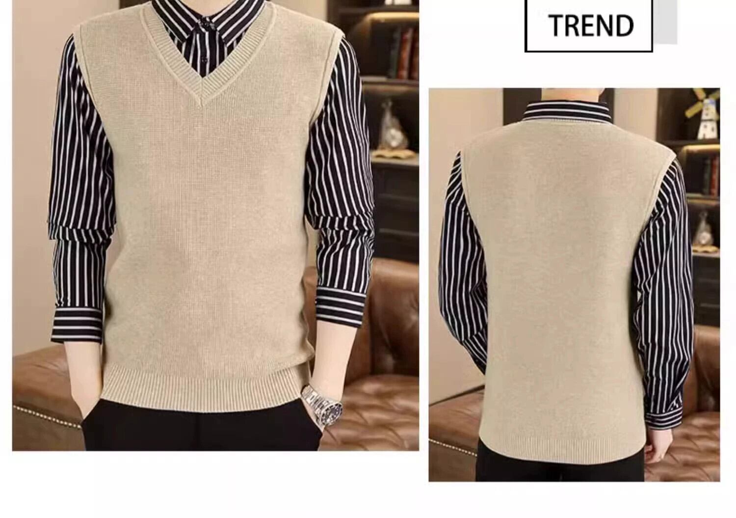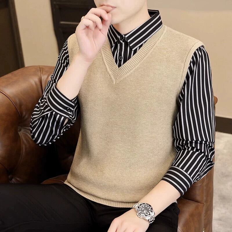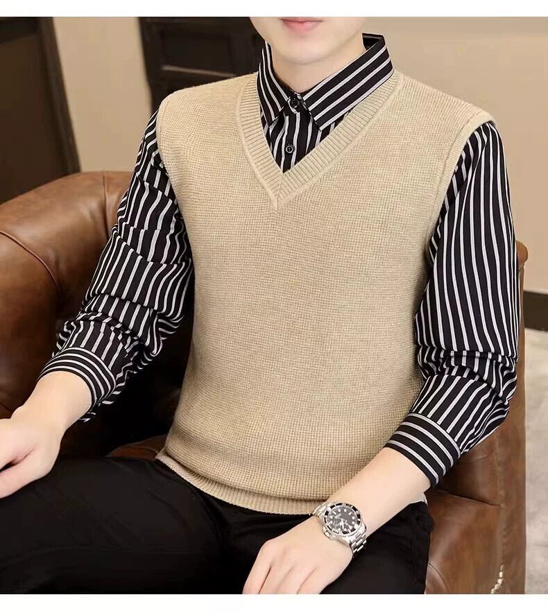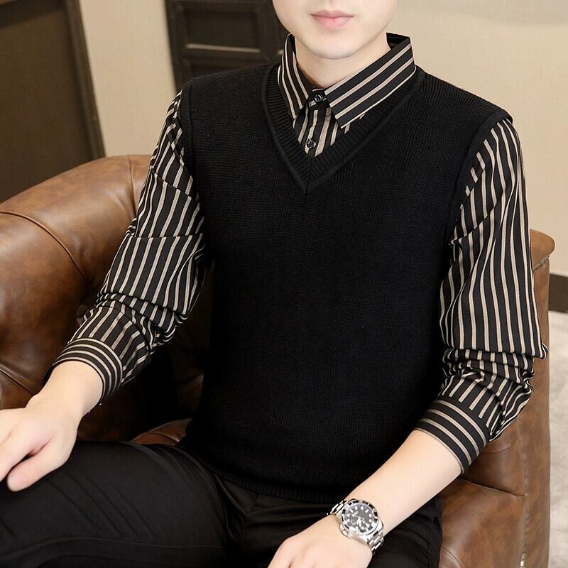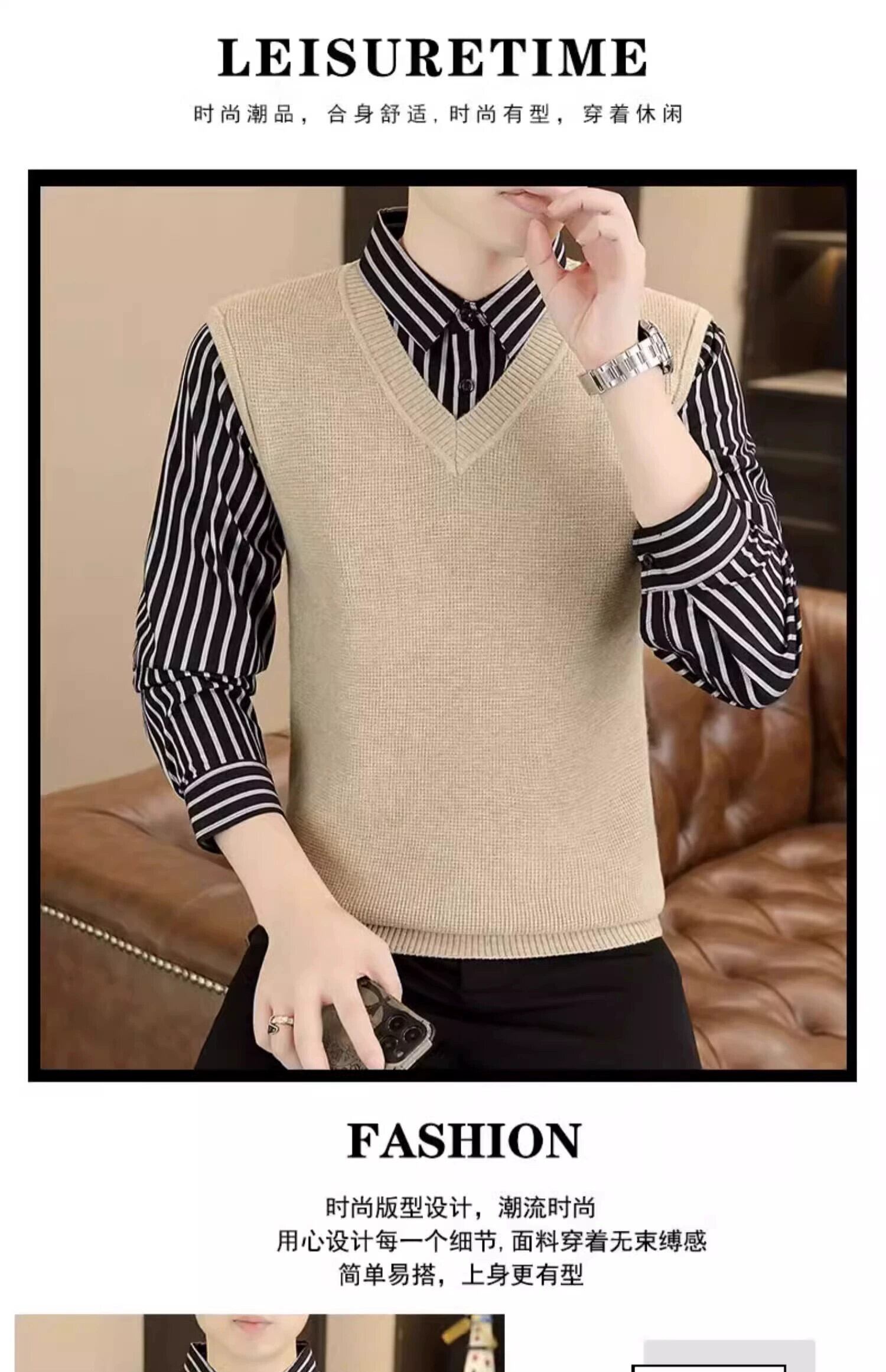メンズシャツ秋と冬の長袖フェイクツーピースストライプセーターセータートレンディカジュアル肥厚暖かいメンズシャツ ロング オータム 秋物 ウィンター 冬物 undao14701072969