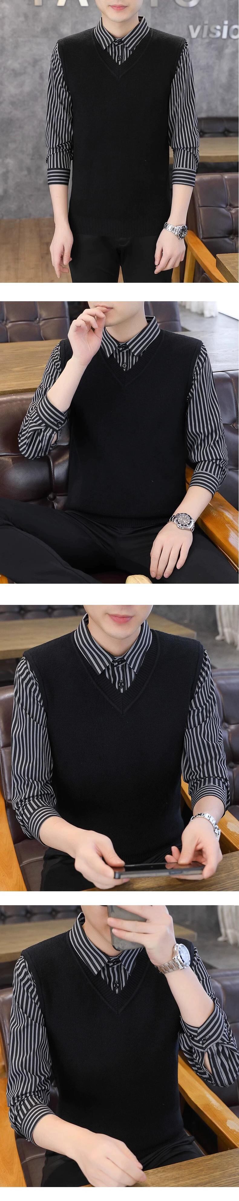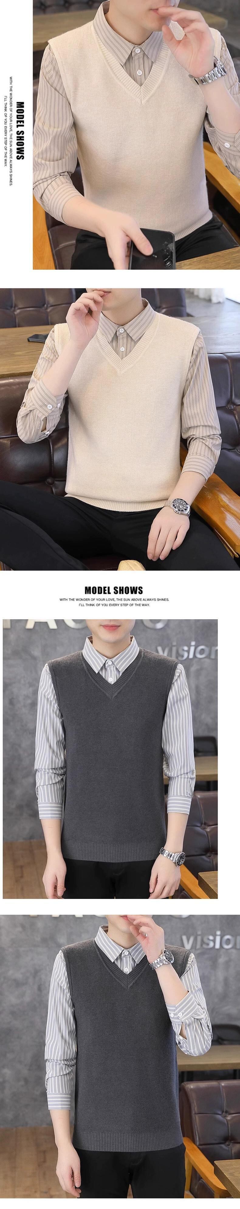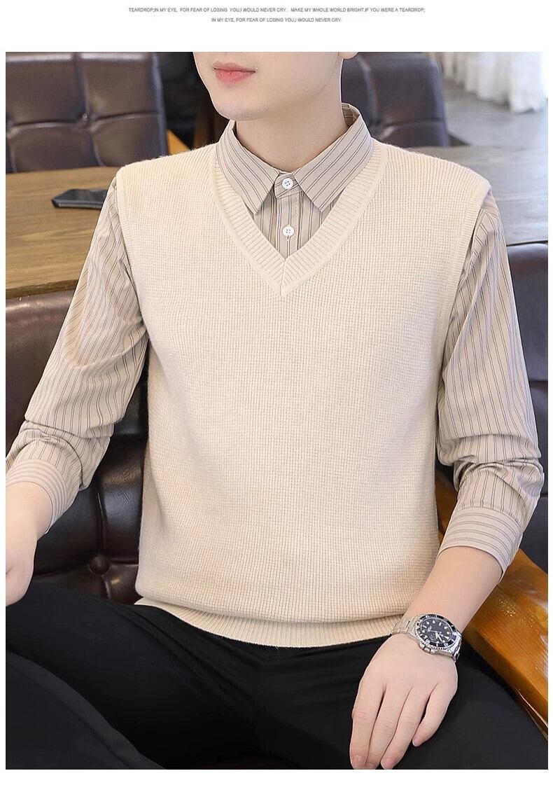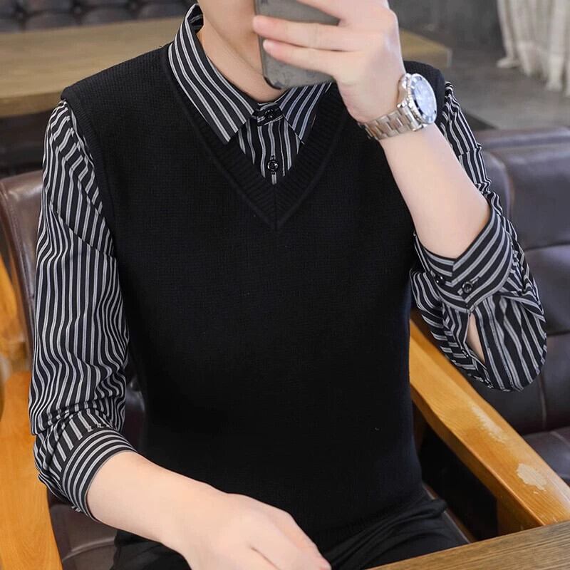フェイクツーピースセーターメンズ秋と冬スリムセータービジネスカジュアルeseシャツ襟ニットボトリングシャツ男性 オータム 秋物 ウィンター 冬物 undao53706271794
