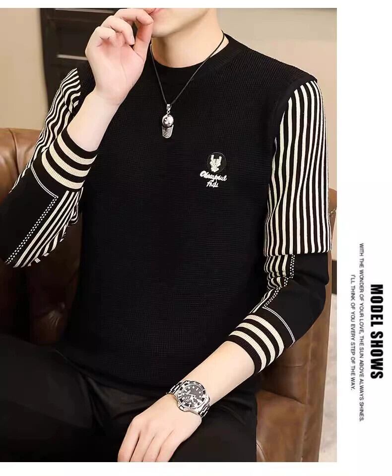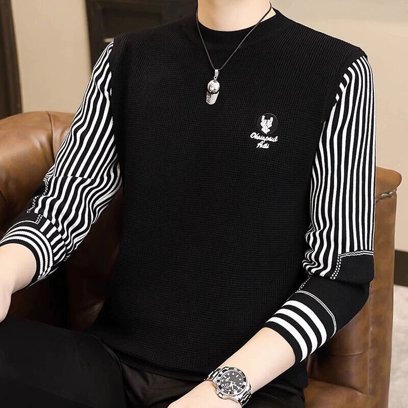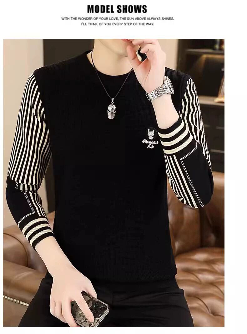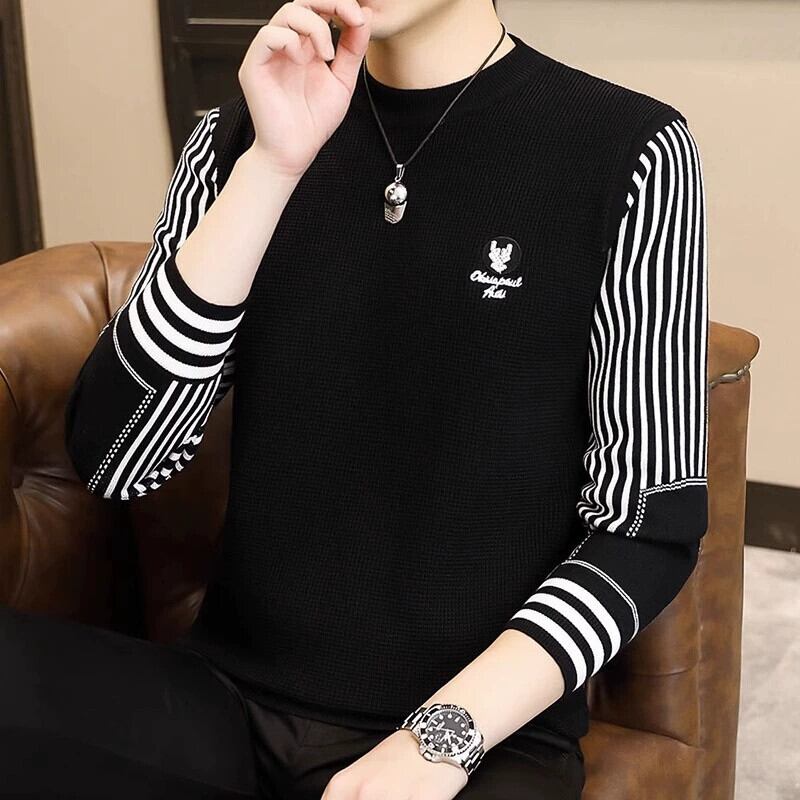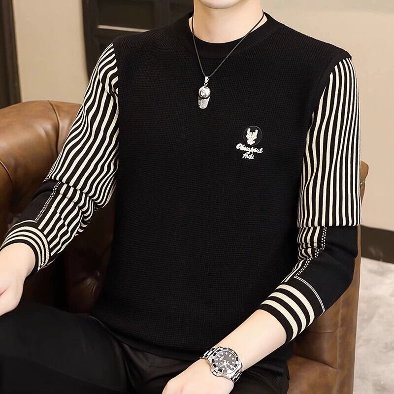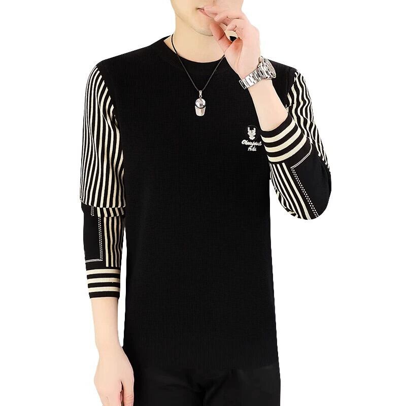 秋と冬のラウンドネック刺繍セーターメンズトレンディなブランドパーソナライズされた長袖ストライプセーターメンズファッションスプライシングボトミングシャツ ロング レッド オータム 秋物 ウィンター 冬物 Oネック undao81191705973