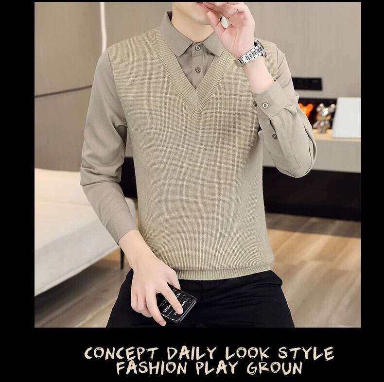 メンズハイエンド偽ツーピースセーター秋と冬のシャツ襟セーターツーピースセット 2023 新しいインナートップポロ オータム 秋物 ウィンター 冬物 undao69764867596