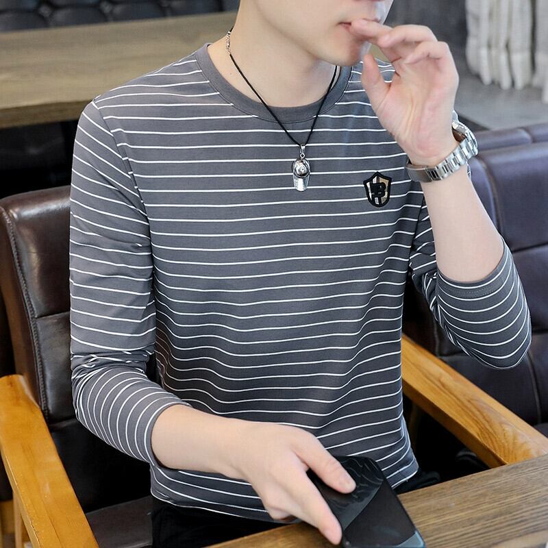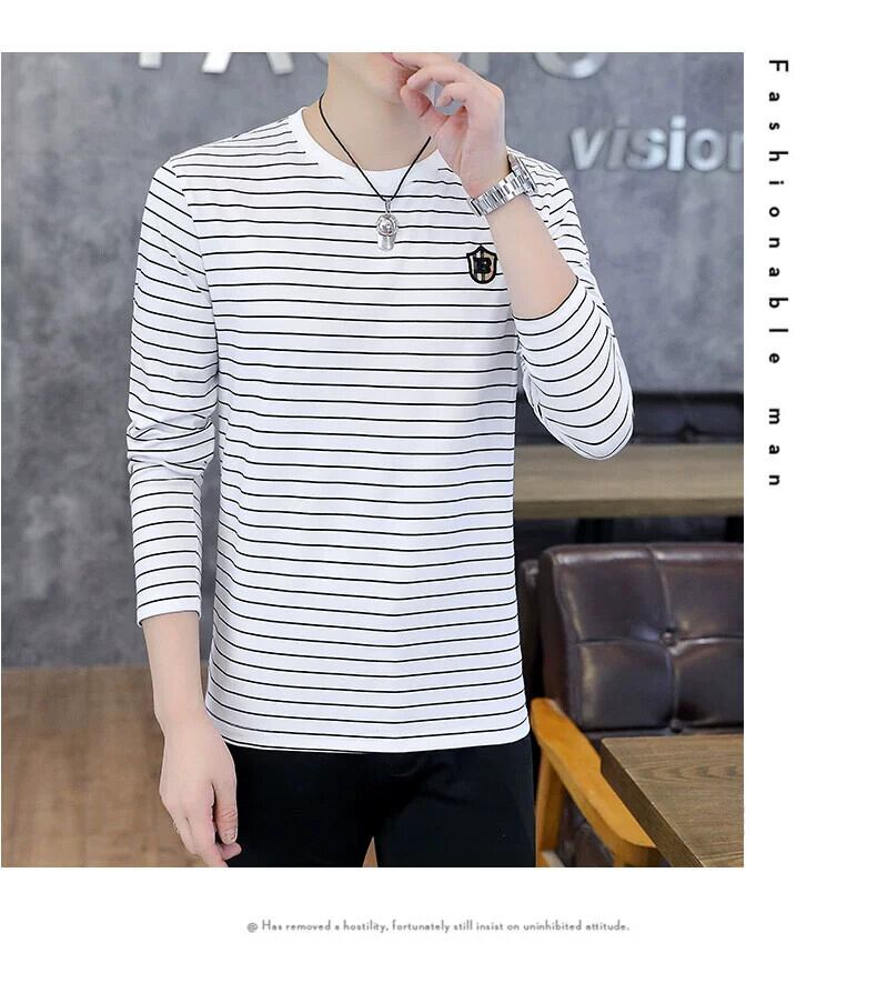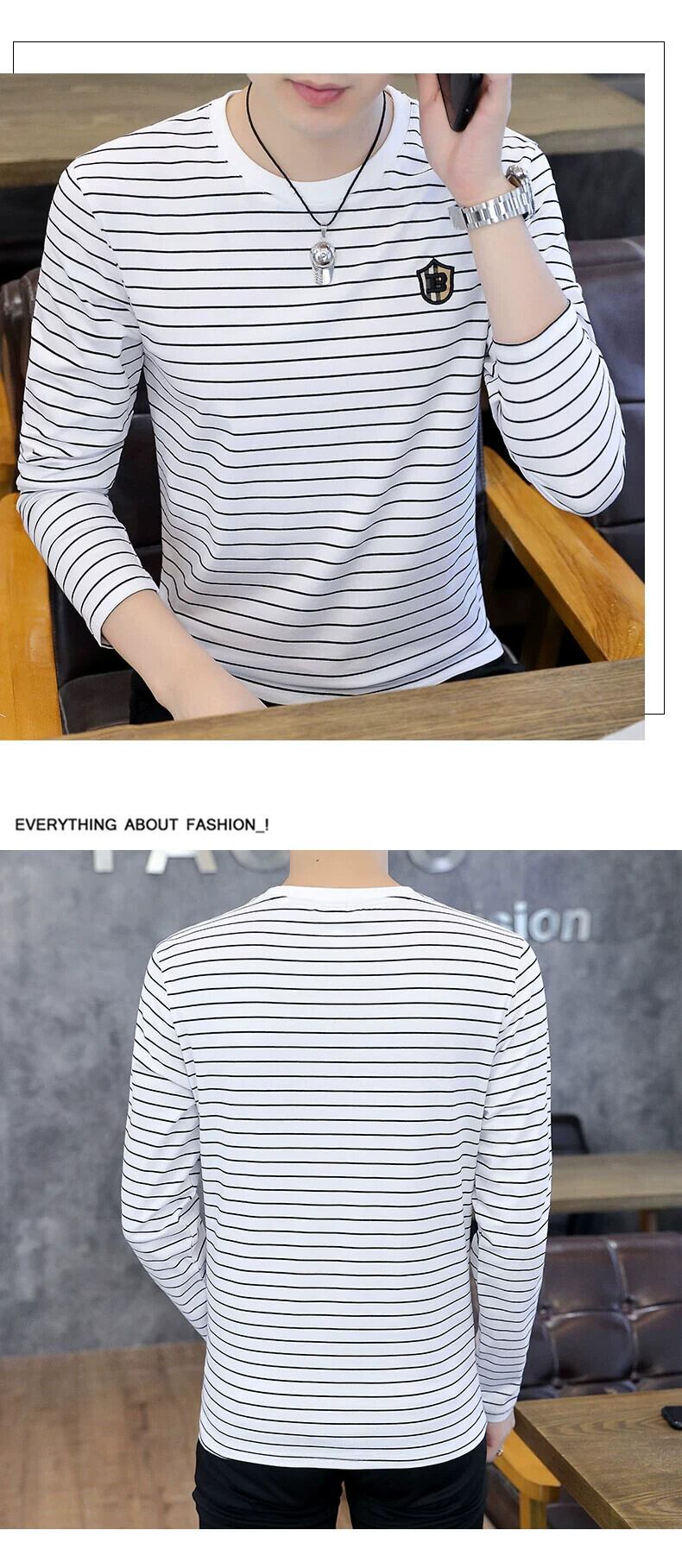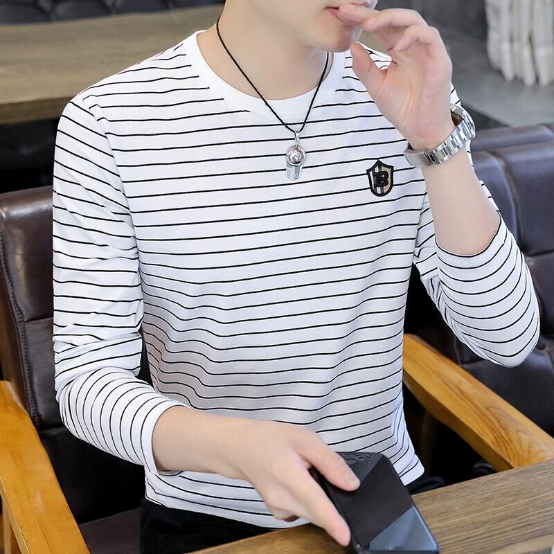 黒と白のストライプの長袖 T シャツ メンズ、春と秋のトレンディな刺繍、スリムな秋のトップス、トレンディなブランドのラウンド ネック ボトム シャツ ロング ホワイト ブラック スプリング 春物 オータム 秋物 Oネック Tシャツ undao14880589654